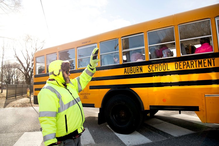 Gordon Grant waves to students Wednesday as the children head home from Walton Elementary School in Auburn. “I think I wave more in a week than some do in a lifetime,” says the longtime crossing guard. Grant said Wednesday was the coldest of the three school days this week that he has helped students and parents cross in front of the school. “I’m just glad that it is not raining,” says the 81-year-old. “Rain is the worst.” Daryn Slover/Sun Journal
