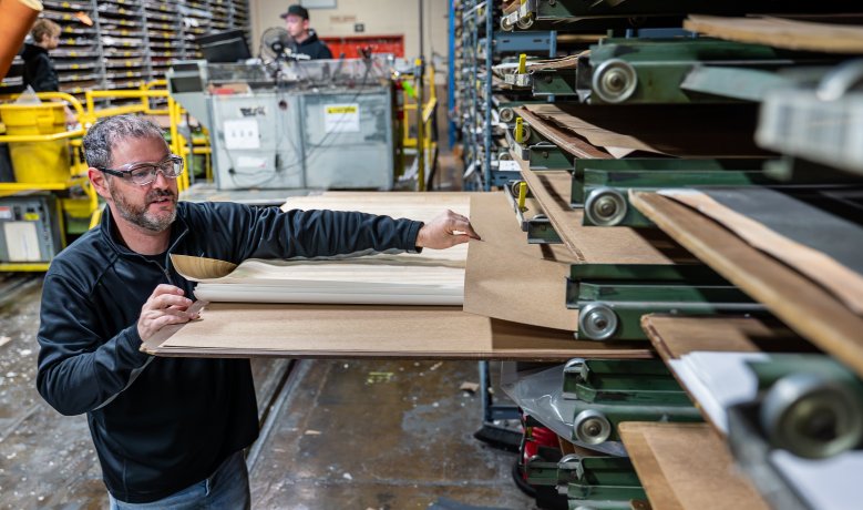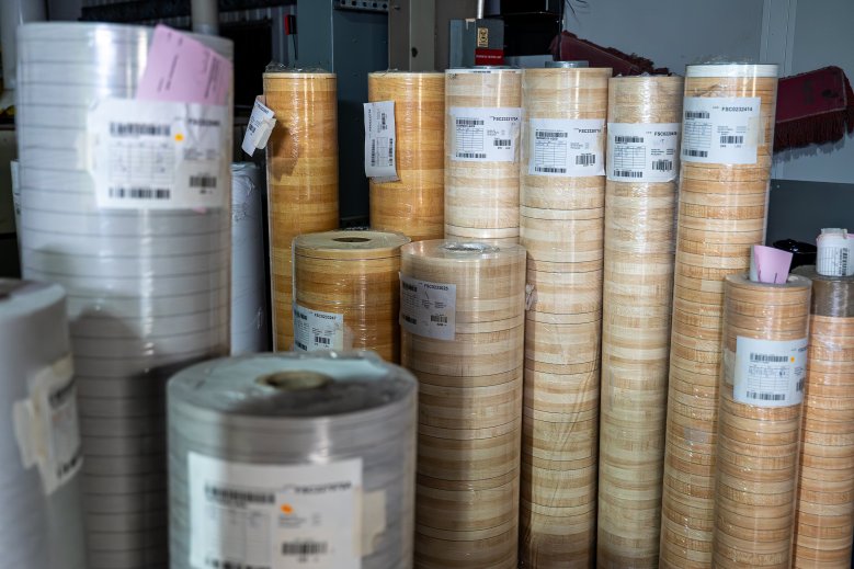 It all starts with giant rolls of brown kraft paper, Panolam Operations Manager John Eberly said. “The resin is impregnated into the paper … by the time it comes out the back is dry and is cut to size.”