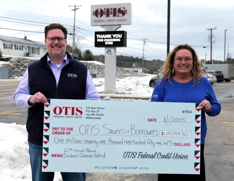 JAY — OTIS Federal Credit Union has announced that a 10% bonus dividend and interest rRefund of $1,071,959 was posted to member accounts on Jan. 1. This return represents the credit union’s financial success in 2024 and is the largest bonus to date. Over the past 20 years, OTIS FCU has returned more than $8 million to both its savers and borrowers through this practice.