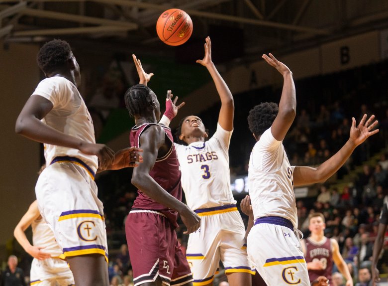 • Edward Little scored the next two baskets on fluky plays. Akol Maiwen (14 points) overthrew a lob to his brother, but the ball came back to Akol, who laid it in. After another empty Cheverus trip, the Stags failed to corral a defensive rebound, and like at the end of the half, EL got to the ball rolling on the floor. TJ Kramarz grabbed it, whipped a pass to Owen Galway (11 points) in the corner, and Galway drained a 3-pointer for a 43-39 lead.