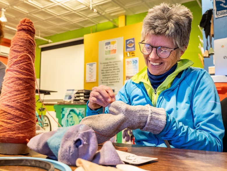 First-time visitors Sean Buchanan from Naples and Betsey Cooper of Bethel both came in with a handful of socks needing to be mended. Within moments they were talking and laughing together and with others like old friends. Buchanan shared that he had just spent time in Germany and Holman struck up a conversation with him in German.