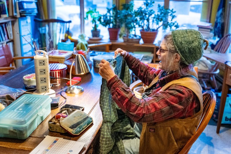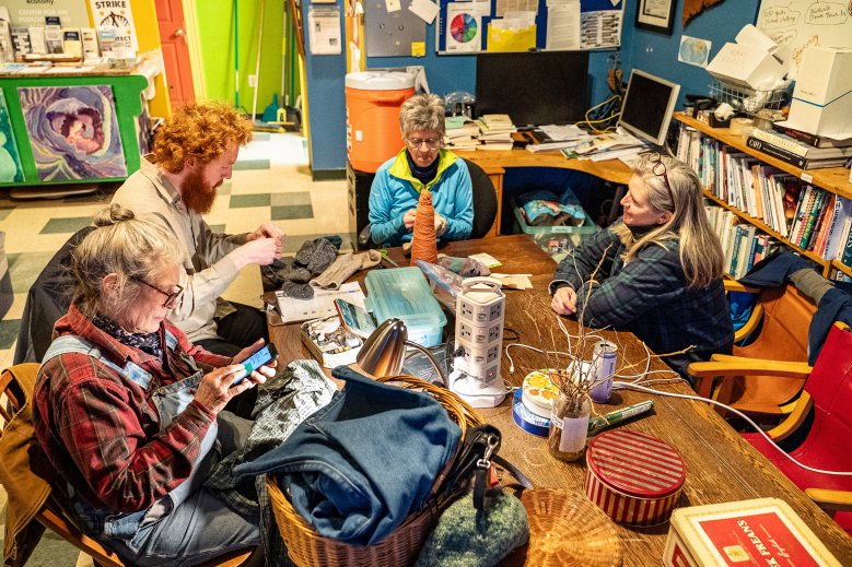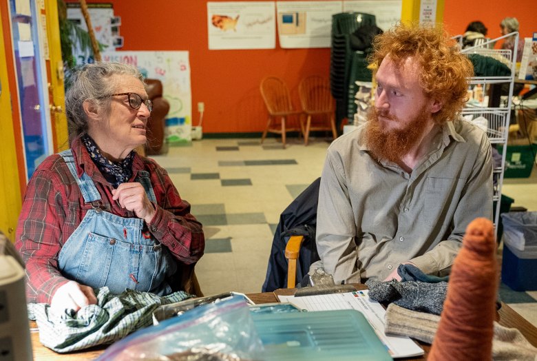 First-time visitors Sean Buchanan from Naples and Betsey Cooper of Bethel both came in with a handful of socks needing to be mended. Within moments they were talking and laughing together and with others like old friends. Buchanan shared that he had just spent time in Germany and Holman struck up a conversation with him in German.