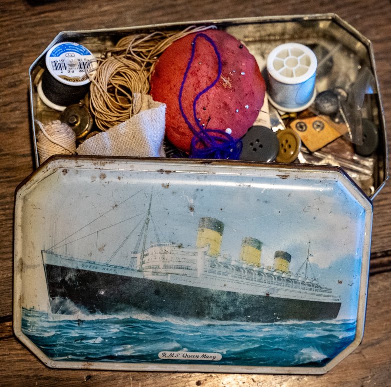 A vintage tin box, a family heirloom, is now filled with Lee Holman’s sewing supplies. Russ Dillingham/Sun Journal