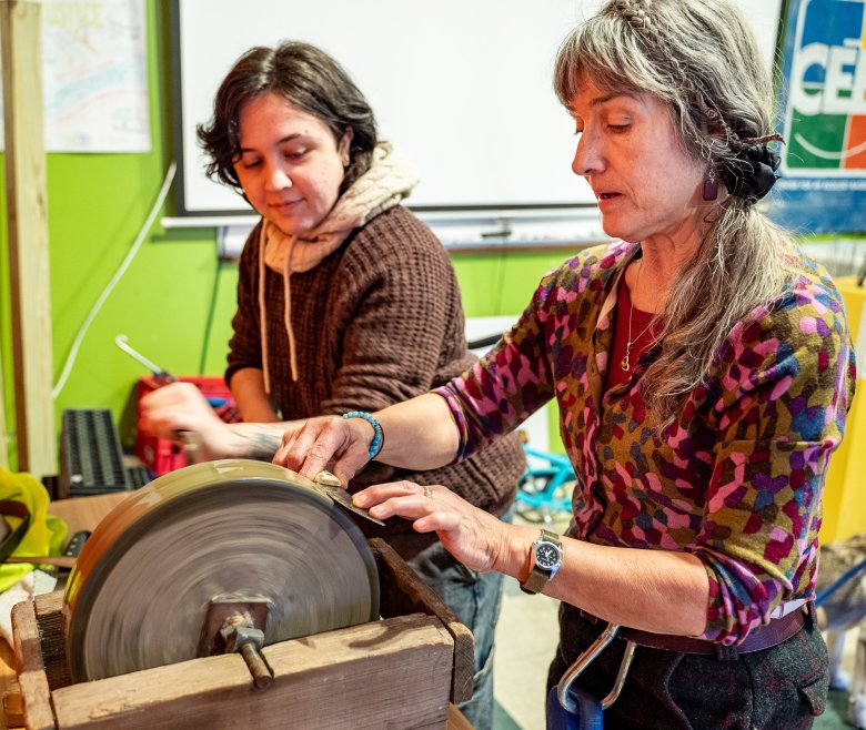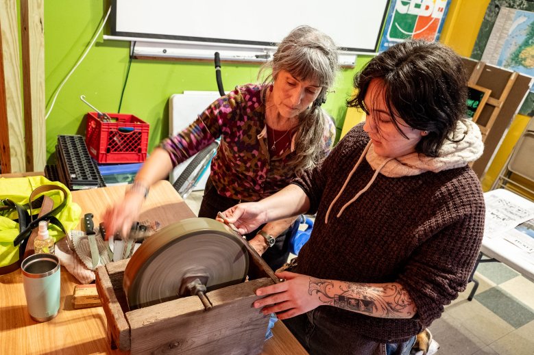 Gianluca Yornet De Rosas and Roberta Hill took turns hand-spinning an old sharpening stone as they worked together honing a dozen knives.