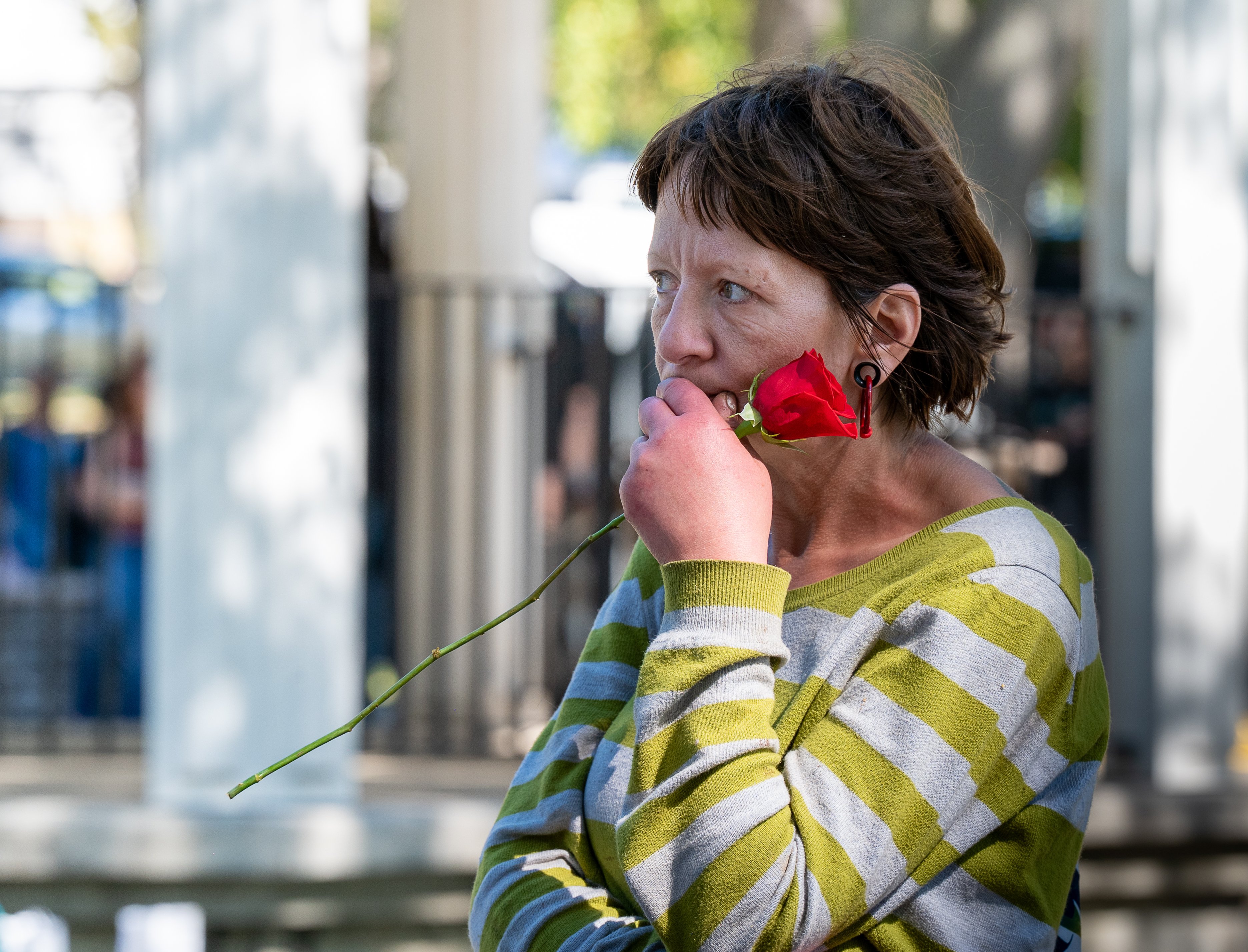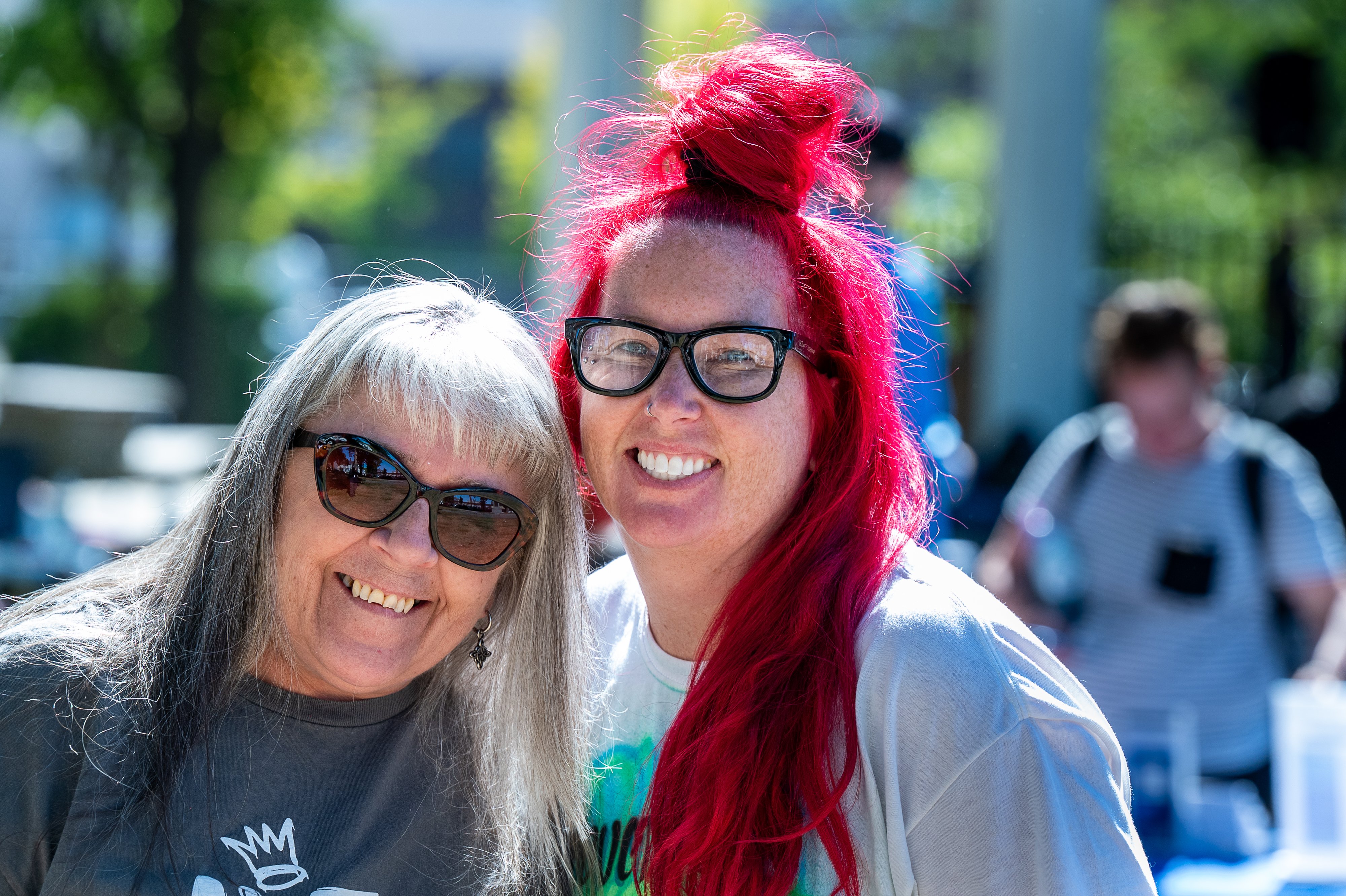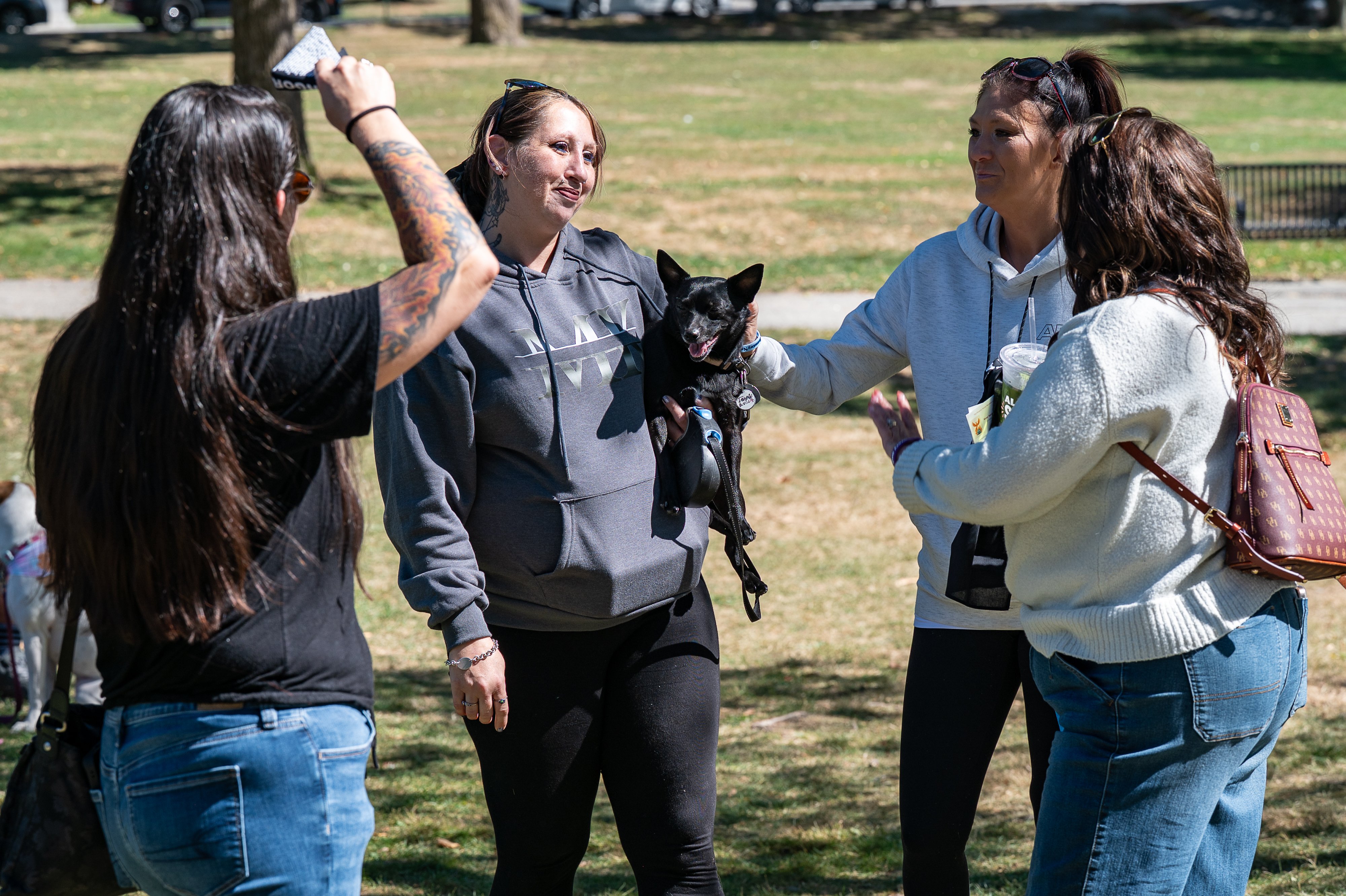 Maine’s director of Opioid Response, Gordon Smith, speaks Saturday afternoon at the Rally for Recovery in the gazebo at Kennedy Park in Lewiston. Presented by the Lewiston Area Public Health Committee, the gathering drew hundreds of outreach workers, councilors and many people who have recovered or are in recovery. In addition to numerous speakers, there were dozens of tables where people could learn about or become involved with recovery, as well as enjoy music, crafts and free food. (Russ Dillingham/Staff Photographer)A woman dances Saturday afternoon at the Rally for Recovery at Kennedy Park in Lewiston. (Russ Dillingham/Staff Photographer)A woman holds a rose while waiting in line for food Saturday afternoon at the Rally for Recovery at Kennedy Park in Lewiston. (Russ Dillingham/Staff Photographer)Pam Whittier, second from right, pets LULU, held by Tamra Hurd, on Saturday in Kennedy Park in Lewiston during a Rally for Recovery. In recovery for the past nine months and eager to share her story of pulling herself out of addiction, Hurd was among hundreds of people who attended the gathering. (Russ Dillingham/Staff Photographer)Kennedy Park bustles Saturday afternoon with people attending Rally for Recovery presented by the Lewiston Area Public Health Committee. Hundreds of outreach workers, councilors and people who have recovered or are in recovery attended. In addition to numerous speakers, there were dozens of tables where people could learn about or become involved with recovery, as well as enjoy music, crafts and free food. (Russ Dillingham/Staff Photographer)Linda Doucette Scott, left, and Jamie Caouette pause for a photo Saturday afternoon during Rally for Recovery at Kennedy Park in Lewiston. Presented by the Lewiston Area Public Health Committee, the gathering drew hundreds of outreach workers, councilors and many people who have recovered or are in recovery. In addition to numerous speakers, there were dozens of tables where people could learn about or become involved with recovery, as well as enjoy music, crafts and free food. (Russ Dillingham/Staff Photographer)