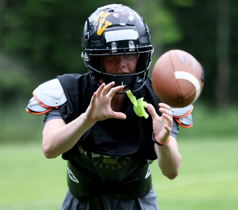 East player Silas Topolski of Foxcroft Academy receives the ball during a Lobster Bowl practice Monday in Dover-Foxcroft. (Anna Chadwick/Staff Photographer)