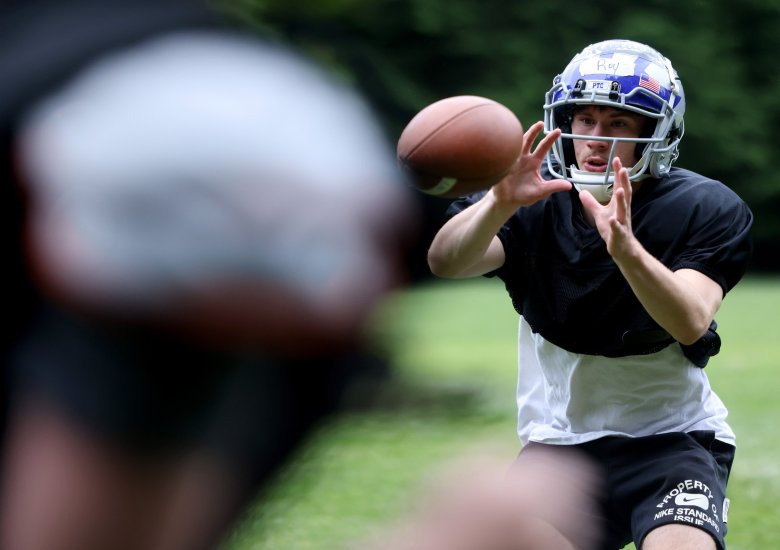 East player Preston Roy of Lawrence receives a pass during Monday morning's practice for the 2025 Maine Shrine Lobster Bowl Classic. (Anna Chadwick/Staff Photographer)