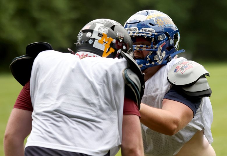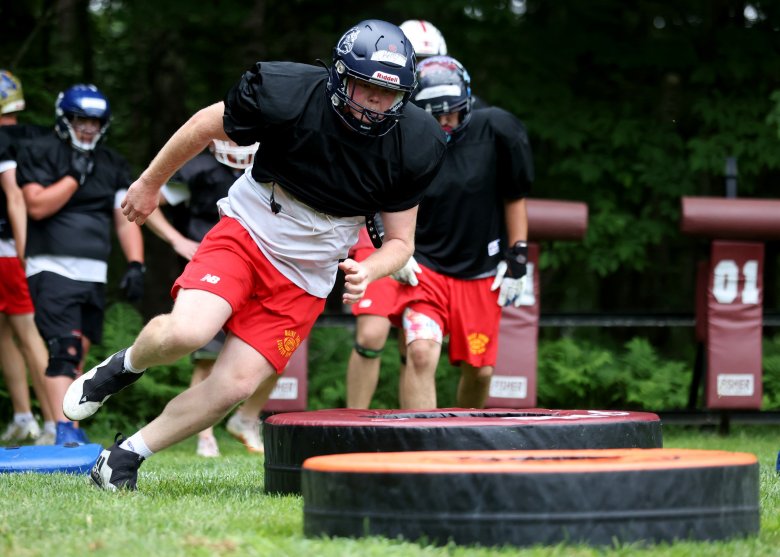 East lineman Owen Bombardier of Falmouth works on blocking during a practice for the 2025 Maine Shrine Lobster Bowl Classic. (Anna Chadwick/Staff Photographer)
