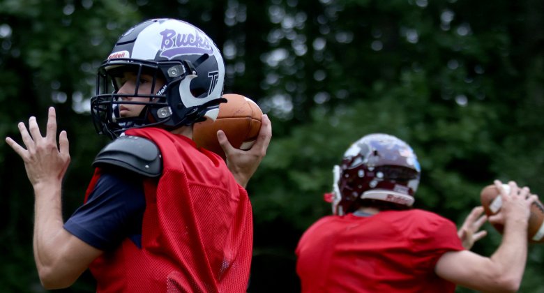 East team quarterbacks Louis Thurston, front, from Portland High School, and Caleb Kennedy, of Stearns High School, throw during a drill while preparing for the 2025 Maine Shrine Lobster Bowl Classic. (Anna Chadwick/Staff Photographer)