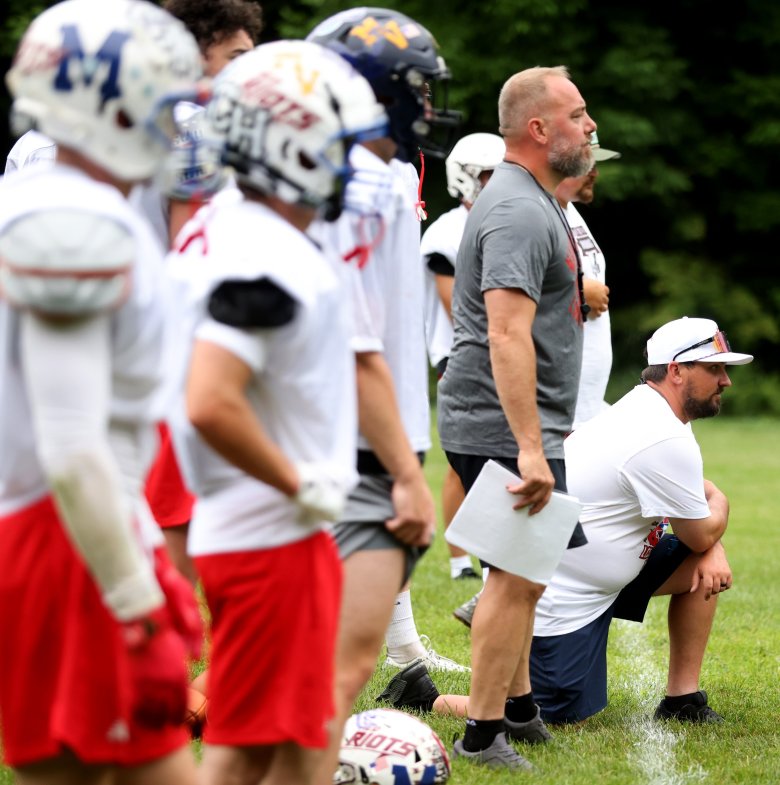 East team head coach Kyle Gallant, from Hermon High School, kneels as he watches his team practice Monday in preparation for the 2025 Maine Shrine Lobster Bowl Classic. (Anna Chadwick/Staff Photographer)