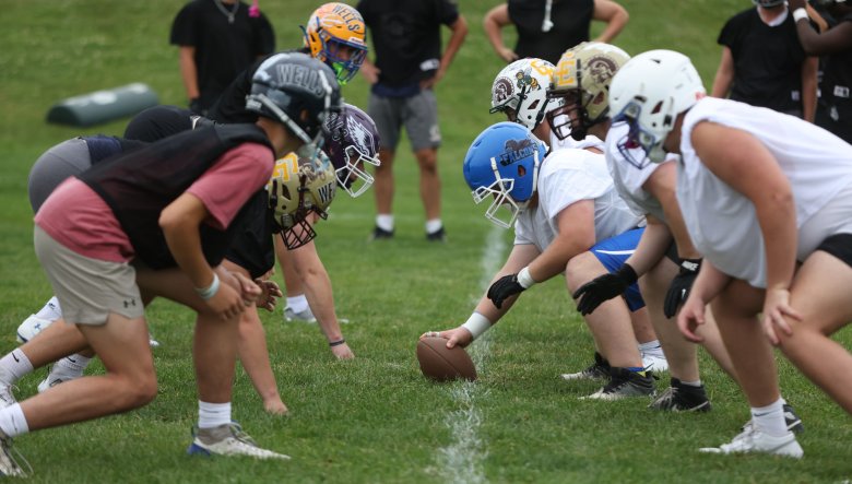 West team members practice Monday at Foxcroft Academy in Dover-Foxcroft in preparation for the 2025 Maine Shrine Lobster Bowl Classic. (Anna Chadwick/Staff Photographer)