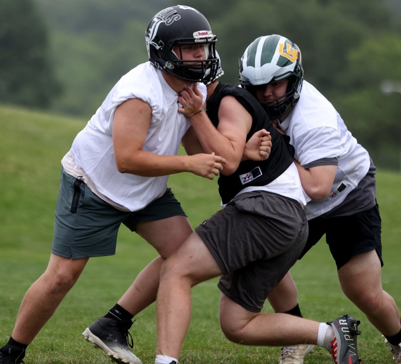 West team member, Kaiden LaValley, left, of Lisbon High School, blocks during a practice Monday at Foxcroft Academy in Dover-Foxcroft in preparation for the 2025 Maine Shrine Lobster Bowl Classic. (Anna Chadwick/Staff Photographer)