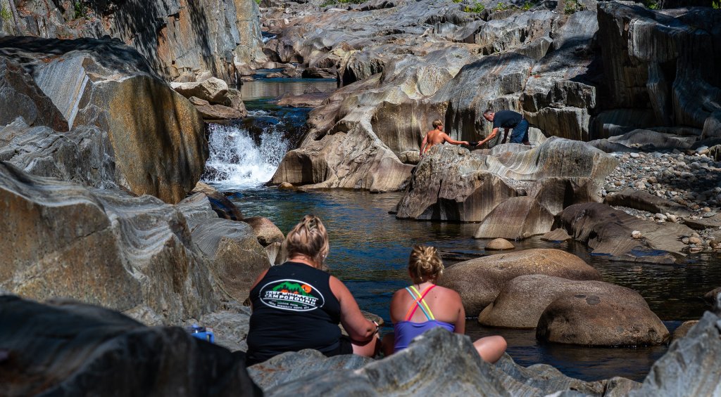 Autumn Pierce, left, and her daughter, Marissa, relax in the sun and watch husband and son, Jeremy, background left, and Zachary, background right, pan for gold Thursday morning along the Swift River in Byron. They are from Chesterville. (Russ Dillingham/Staff Photographer)