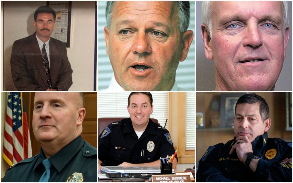 Former Lewiston police chiefs, top row from left, Michael Kelly, Bill Welch and Larry Gilbert; and bottom, Brian O’Malley and Mike Bussiere, and current Chief David St. Pierre. The city is launching a search for the next chief following the announcement that St. Pierre will be retiring. (Combination of courtesy and staff photos)