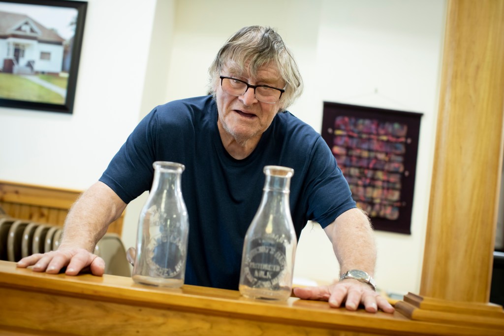 “I’ve got more at home,” Shaw said casually – and he wasn’t exaggerating. His full collection totals more than 4,000 milk bottles, displayed floor-to-ceiling in a 12- by 22-foot garage. A central divider holds even more, and across the road, a separate “milk room” houses the overflow.