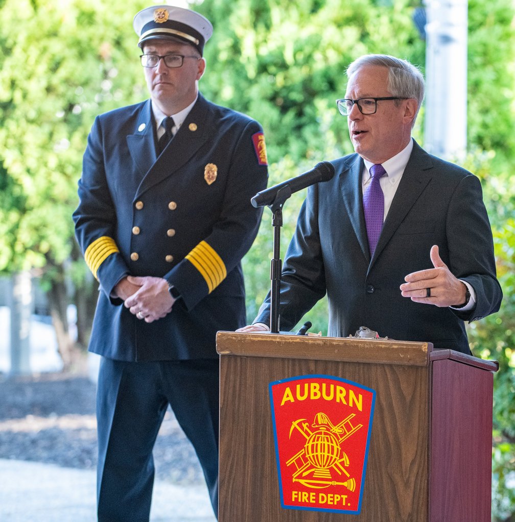 Auburn Mayor Jeff Harmon addresses a 9/11 memorial ceremony in 2024 at Central Fire Station at 550 Minot Ave. Harmon will be unopposed for a second term this November. (Russ Dillingham/Staff Photographer)