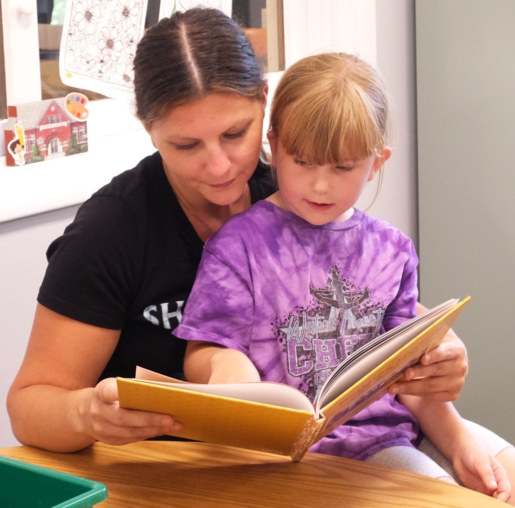 Rumford Elementary School kindergarten teacher Jessica Curato opens the book “Building Dreams as a Team” to the story of “The Missing Kitten” on Aug. 12 at the Rumford Public Library. The story was was written by kindergartner Ariel Whittemore. (Bruce Farrin/Staff Writer)
