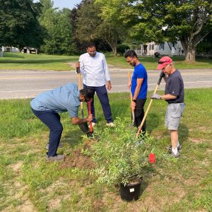 Casco’s Open Space Commission delivered two flowering shrubs as a welcome gift to the owners of Casco Gas & Convenience in August. From left, owners Gaurav Patel, Gunjan Patel and Dipen Patel work with commission member Jim Arsham to plant one of them. (Photo courtesy of Sam Brown)