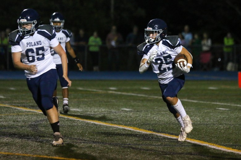 Poland’s Miguel Cyr picked up one of those high snaps and returned it 30 yards for a touchdown. The ensuing 2-point conversion was successful for a 28-0 lead with 4:44 left in the third quarter.