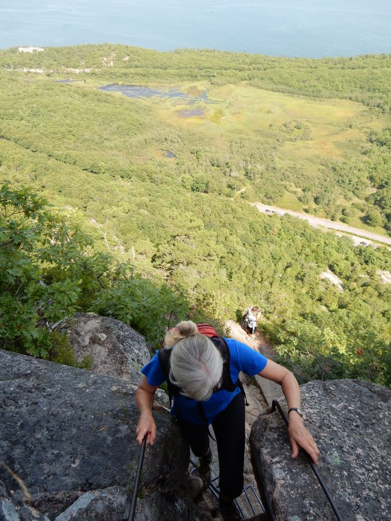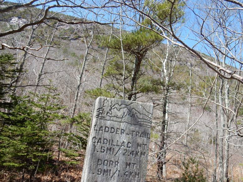 The Ladder Trail ascends the steep slabs on the east slope of Dorr Mountain, connecting the Kane Path near the Tarn to the Schiff Path at the 800-foot elevation contour. The trail was built in the late 1890s under the supervision of Herbert Jacques of the BHVIA, and in the mid-1930s, it was rebuilt and parts of it relocated by the Civilian Conservation Corps. From the top of Ladder Trail, scamper to the top of Dorr for a fine panoramic vista.