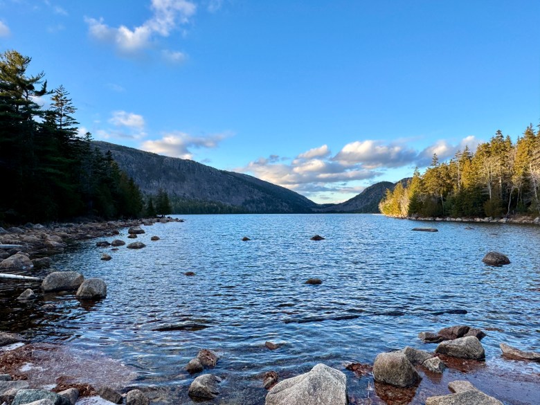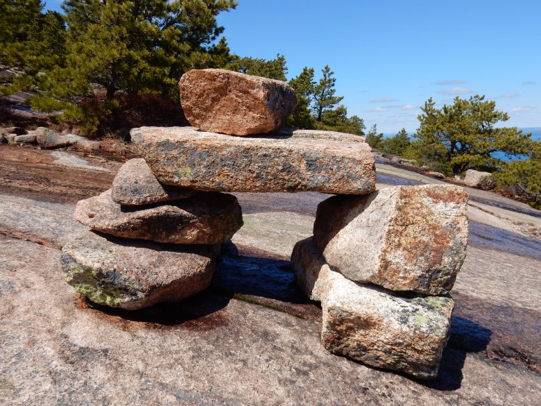 The Jordan Cliffs Trail crosses the sharp east face of Penobscot Mountain, following a rising contour above magnificent Jordan Pond. Originally known as the Jordan Bluffs Trail (circa late 1890s), the wild traverse of the 500-foot cliffs is the work of Waldron Bates, the indefatigable trail builder for whom the “Bates Cairn” is named. You’ll find these unique cairns — constructed of two to four base stones, a lintel stone and a pointer rock — marking the bare rock sections of Acadia’s mountain paths.