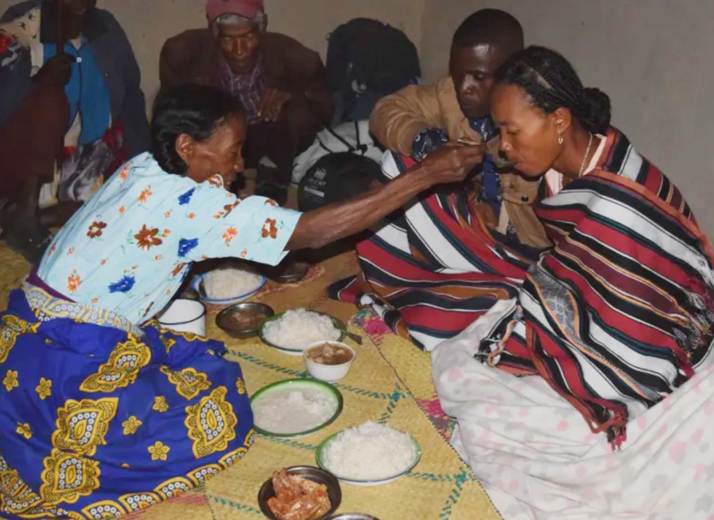 During dinner on their wedding night, Fanja’s mother-in-law feeds Fanja and her husband, Julien, rice seven times each. Fanja said it was tradition but could not explain the significance behind it. (Courtesy of Vanessa Paolella)