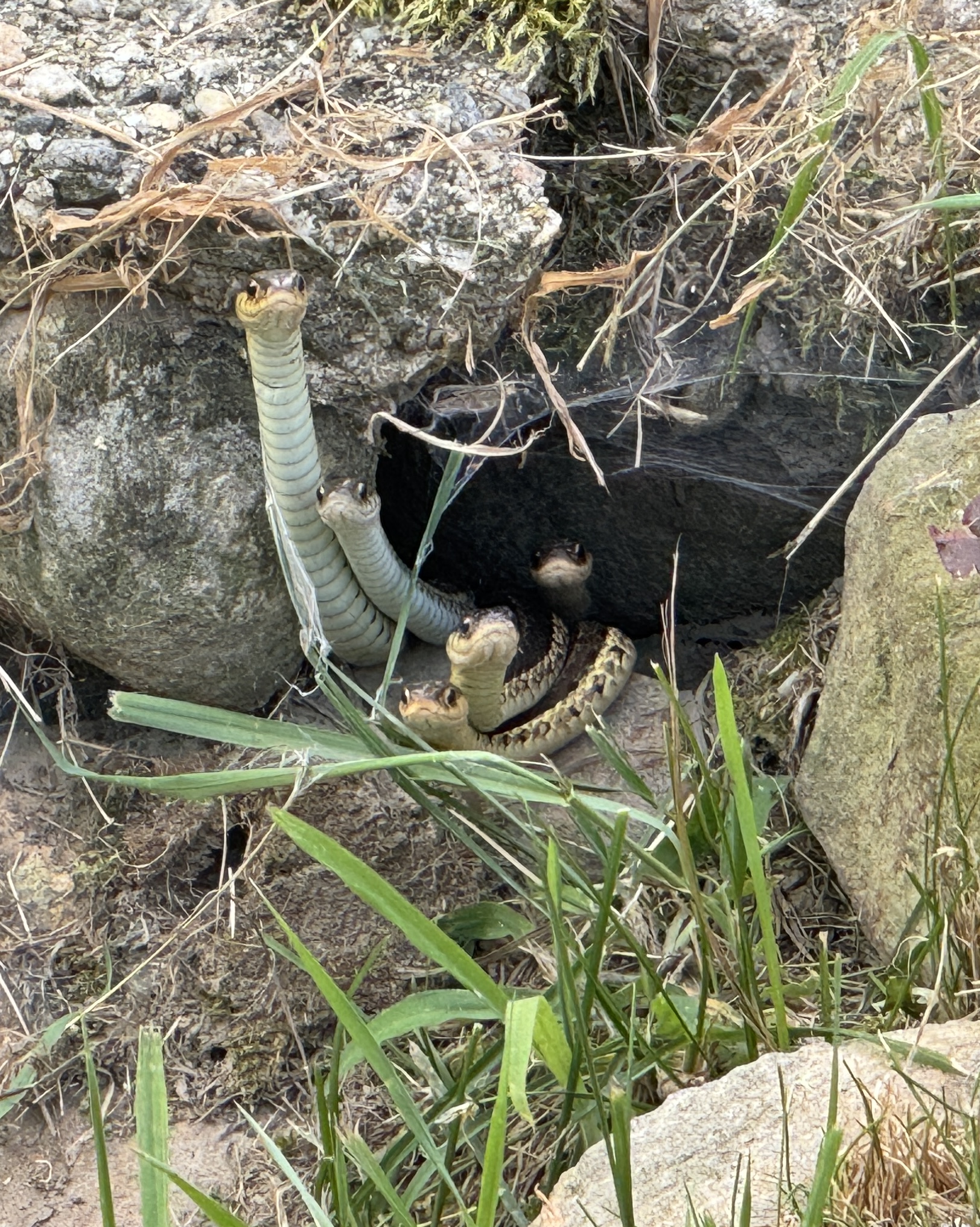 A bed of garter snakes cannot seem to decide whether to venture out from their retaining wall for some late summer sun or retreat to their rocky den for the season. Rather than hibernating, snakes enter a state of inactivity called brumation during colder months. Their metabolism slows down significantly in response to cold temperatures, leading them to seek out sheltered places like burrows, caves, or under logs to avoid freezing and conserve energy.  (Nicole Carter/Staff Writer)