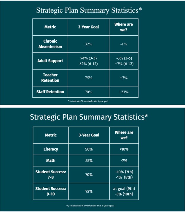 Goals were also set to improve performance rates on standardized testing for literacy (42% to 50%) and math (48% to 55%). Over the past two years literacy scores have increased to 60%.