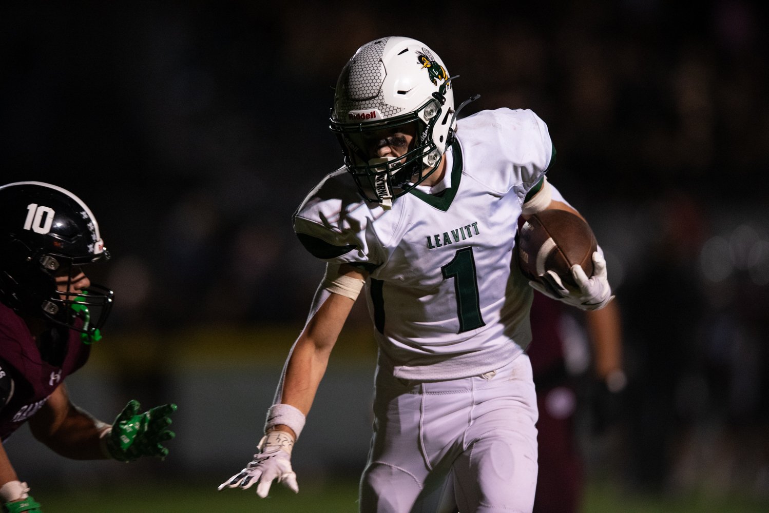 Mason Henderson carries the football Sept. 12 for Leavitt Area High School of Turner during a third quarter scoring drive against Greely High School in Cumberland Center. (Libby Kamrowski Kenny/Staff Photographer)