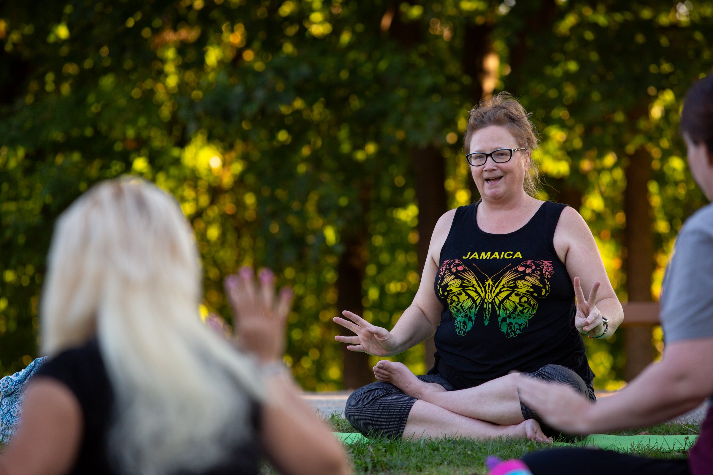 Melissa St. Pierre guides a Yoga in the Park session Monday at Simard-Payne Memorial Park in Lewiston. St. Pierre has been leading the free weekly classes this summer through the Lewiston Parks and Recreation Department. Two more classes are scheduled at 5:30 p.m. Mondays this month. Attendees need to bring a yoga mat. St. Pierre is also the owner of Honeybee Healing Hive Yoga and Wellness at 170 Main St. in Auburn. “It just brings me so much joy to be able to do this,” she said. (Libby Kamrowski Kenny/Staff Photographer)