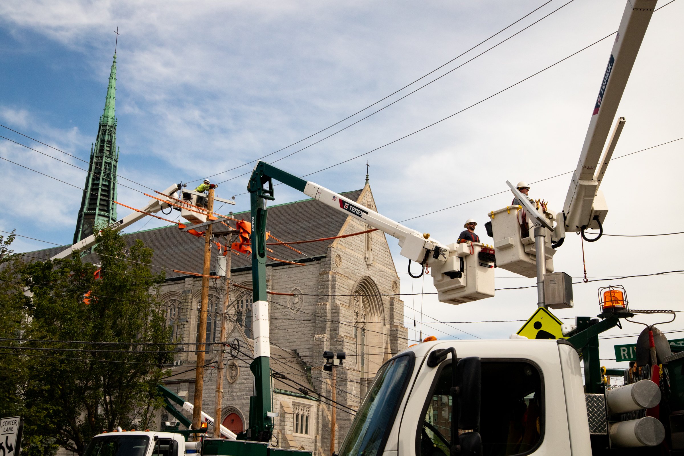 Linemen from Portland-based On Target Utility Services maintain power lines over Cedar Street in Lewiston. The regularly scheduled maintenance involved setting up lines with backup circuits to restore power faster during outages. (Libby Kamrowski Kenny/Staff Photographer)