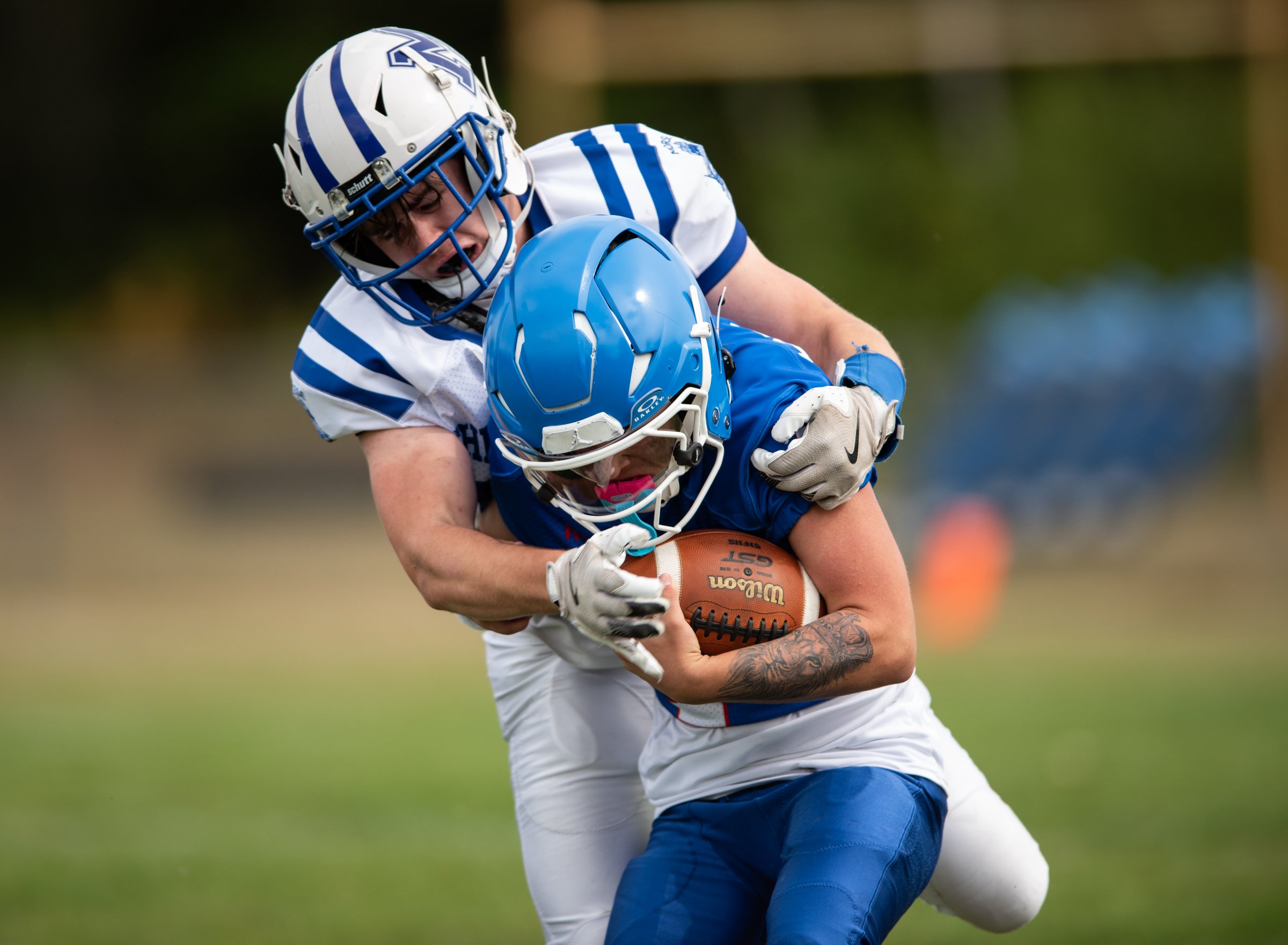 Nathan Trask of Morse High School in Bath tackles Oak Hill’s Keeghan Morrissette Sept. 13 in Sabattus. (Libby Kamrowski Kenny/Staff Photographer)