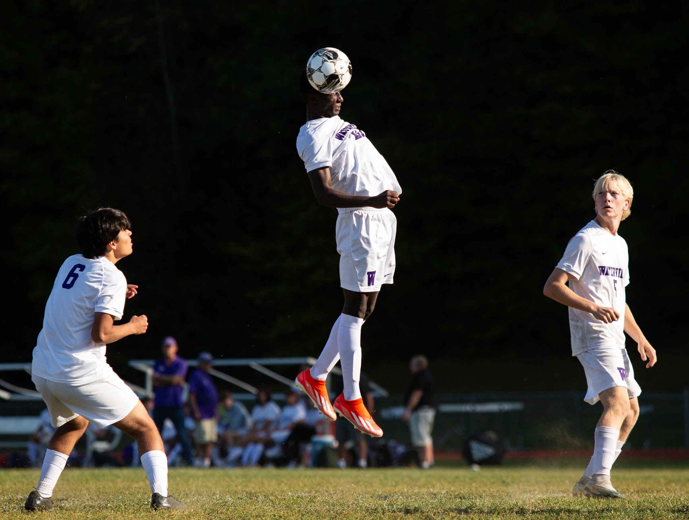 Waterville High School’s Musa Diakite goes for a header during a soccer game Tuesday against Leavitt Area High School in Turner. (Libby Kamrowski Kenny/Staff Photographer)