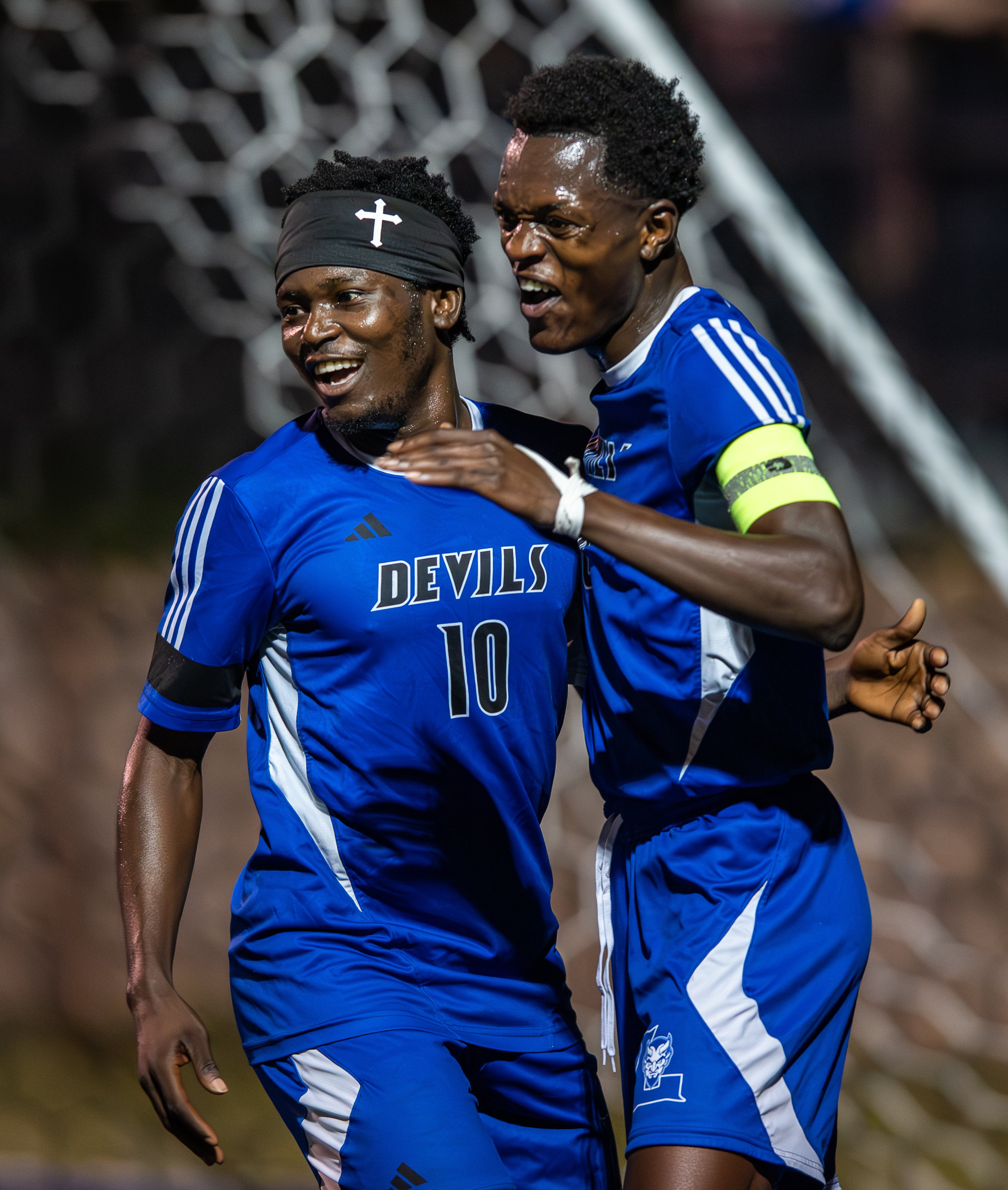 Lewiston High School’s Mechi Mbele, left, and Nathan Dimandya celebrate Thursday in Lewiston after Mbele scores in the 8-0 win over Mt. Blue High School of Farmington. (Russ Dillingham/Staff Photographer)
