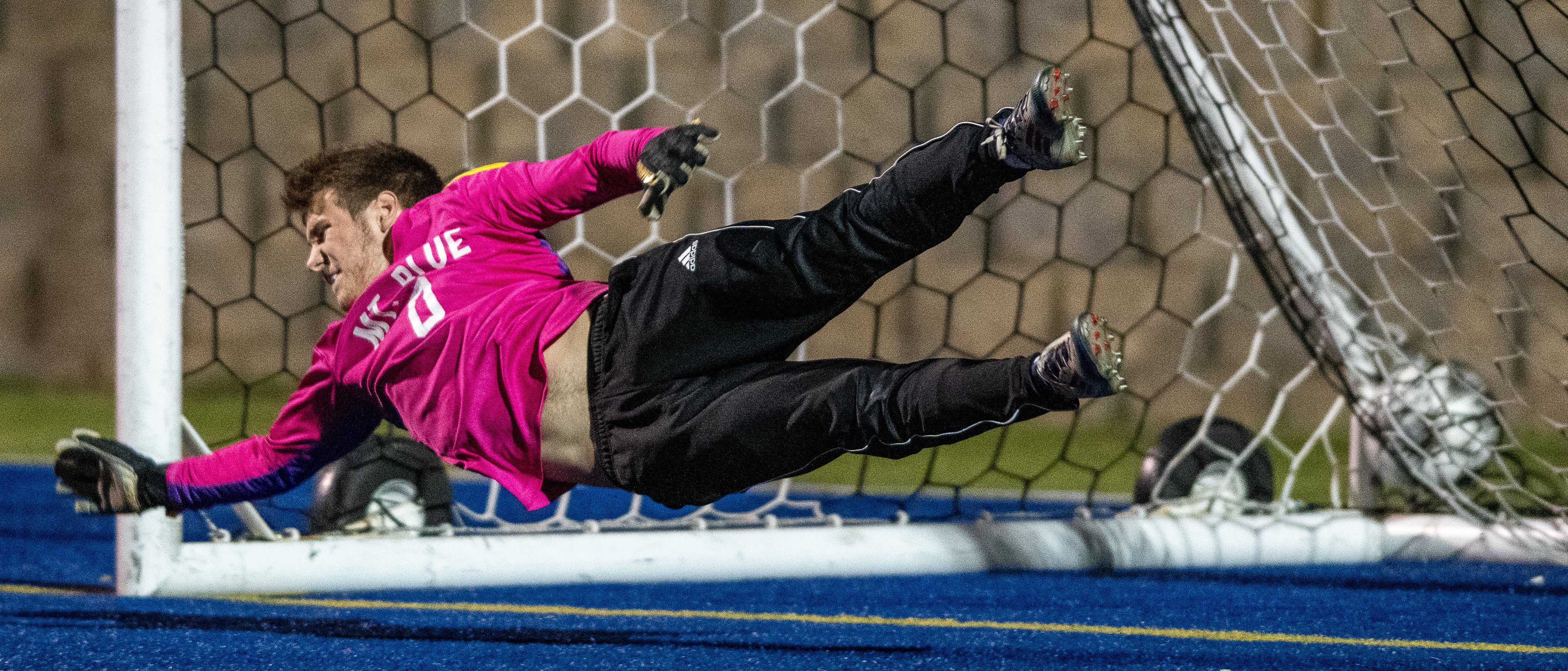 Mt. Blue High School soccer goalie Kooper Keller dives for a penalty kick by Lewiston High School’s Nathan Dimandya that found the back of the net Thursday in Lewiston. (Russ Dillingham/Staff Photographer)