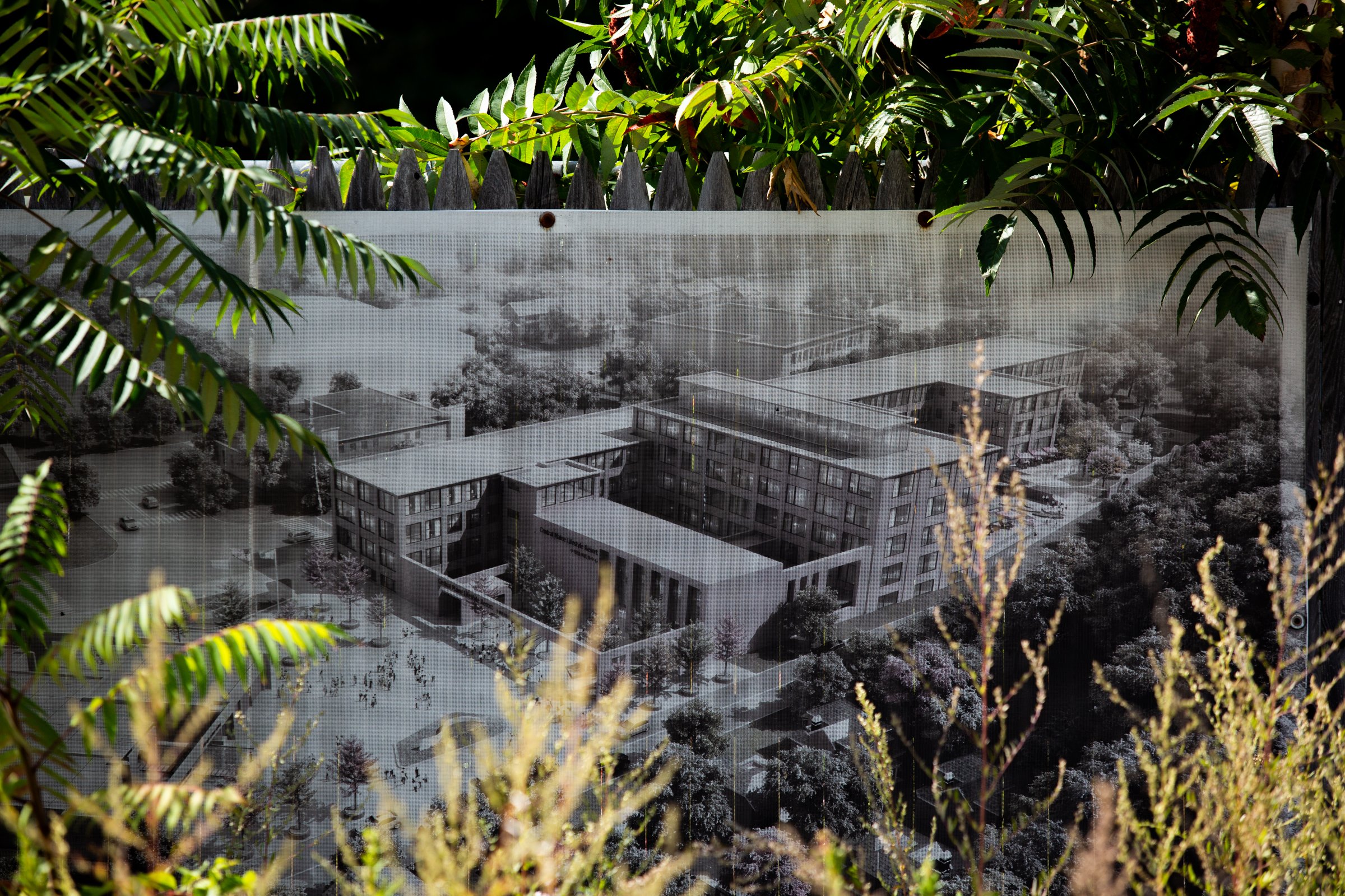 A rendering seen Sept. 15 shows what was once envisioned for the former shoe factory at 67 Minot Ave. in Auburn. It hangs on a fence outside the property among overgrown vegetation. In 2015, Miracle Enterprises bought the property with the goal of creating a $40 million health care facility to provide American medical procedures to wealthy Chinese citizens. (Libby Kamrowski Kenny/Staff Photographer)