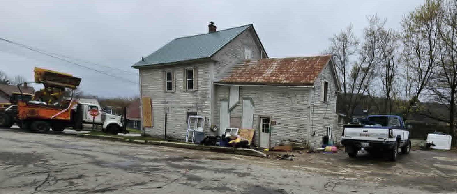 A Mexico Public Works crew cleans up debris in May outside the home of Norman “Bo” Thompson at 9 Oxford St. The Board of Selectmen voted unanimously Tuesday to have the house demolished as a nuisance and danger. (Courtesy photo)
