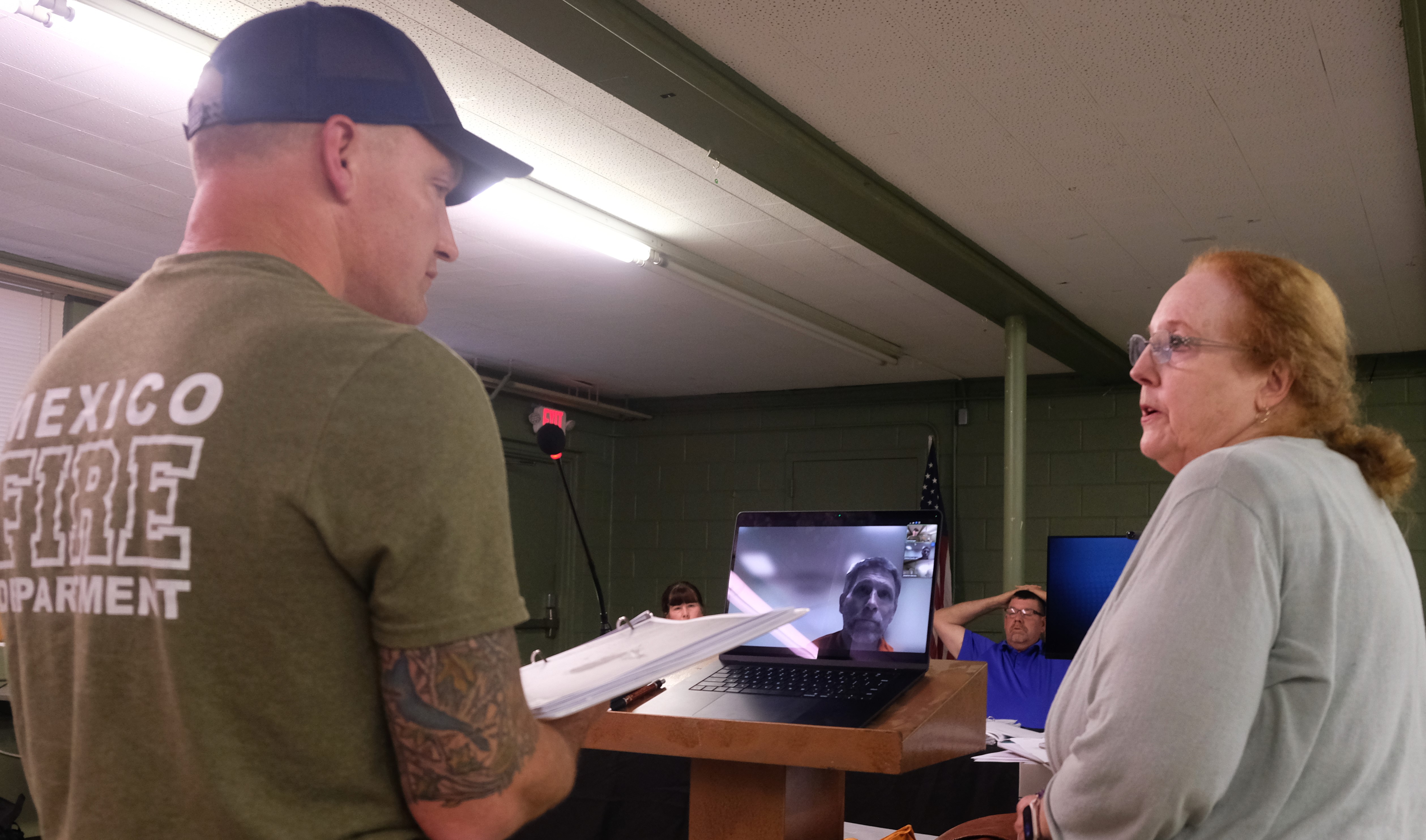 Norman “Bo” Thompson of Mexico, pictured on laptop screen Sept. 16, listens from the Oxford County Jail in Paris as Mexico Code Enforcement Officer Mathew Theriault and town attorney Jennifer Kreckel discuss problems with Thompson’s 9 Oxford St. home during a lengthy public hearing at the Mexico Town Hall. Behind them are Mexico Select Board members Malinda Stewart, left, and Richie Philbrick. (Bruce Farrin/Staff Writer)