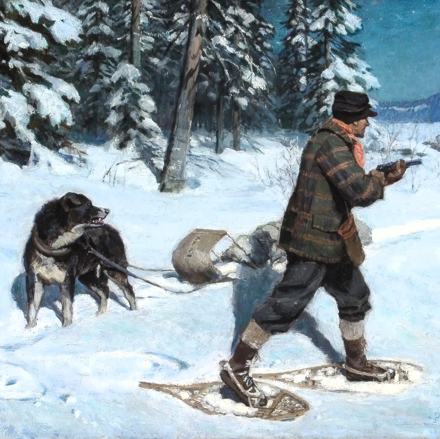 In January 1895, Warden Bill Moriarty volunteered to capture Savarin or scare him so badly that he never would come back to Maine. Accompanied by Tom Sheehan, a big telegraph lineman of Bangor, Bill started for Washington County carrying a whole arsenal of firearms and provisions enough to last a month. On the headwaters of the St. Croix, they found the bodies of three frozen moose, and they knew that Savarin was nearby. Lying in sleeping bags and kindling no fires, they walked about sixty miles northwest and found a whole yard of dead caribou that had just been skinned. Nearby, hidden under an upturned tree were sixty-three caribou and eighteen moose hides. Following Savarin’s tracks a few miles further, they saw a strip of birch bark pegged to a tree. Scratched in charcoal on this bark was a rude drawing of Savarin aiming his rifle at Moriarty and Sheehan. On the other side of the bark was a charcoal sketch of Savarin giving a war dance upon the bodies of the two wardens. This was put up to tell the wardens that they would be shot if they went on. They walked two miles deeper into the woods, wallowed down a great tract of snow, and turned their snowshoes heels in front, retraced their steps and concealed themselves close to the hidden pile of hides, knowing that Savarin would return for his treasures in a short time. For two days they waited. The weather was so cold that the Bangor whiskey which the wardens had brought along to use in case of sickness, froze up and broke the bottles. Early on the morning of the third day, when both men were badly frost bitten, they heard the familiar crunch of snowshoes coming through the woods half a mile away. Moriarty gave Sheehan his instructions, and, putting on his snowshoes, made a wide detour in order to come in behind Savarin. Sheehan, fixing up a dummy, left it in his exposed sleeping bag and hid in a fir thicket which Moriarty had designated. Savarin, expecting some sort of ruse, came on cautiously.