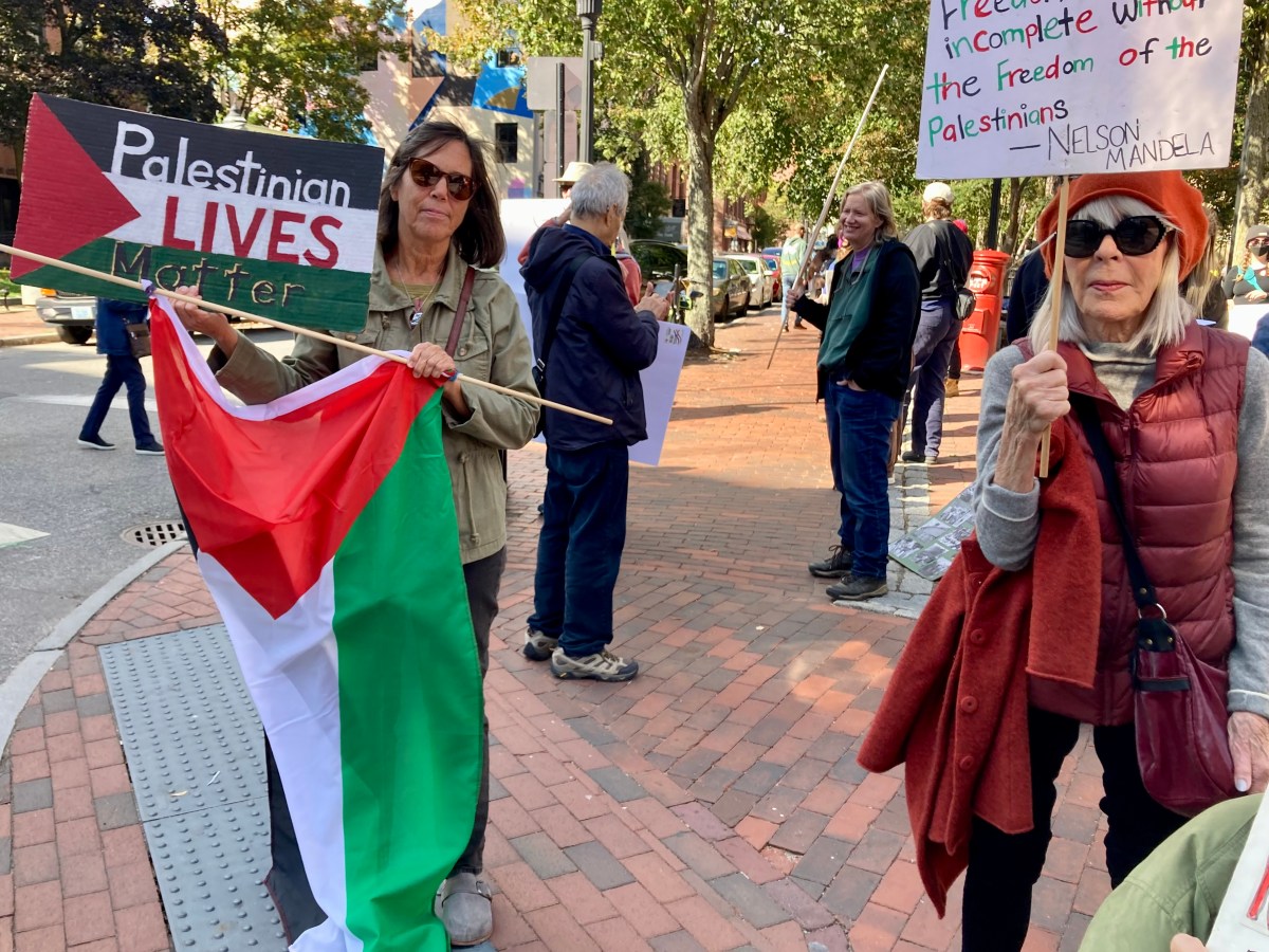 About 100 people stood with signs that read ‘Palestinian Lives Matter’ and ‘Wage Peace’ during the protest organized by the Maine Voices for Palestinian Rights.
