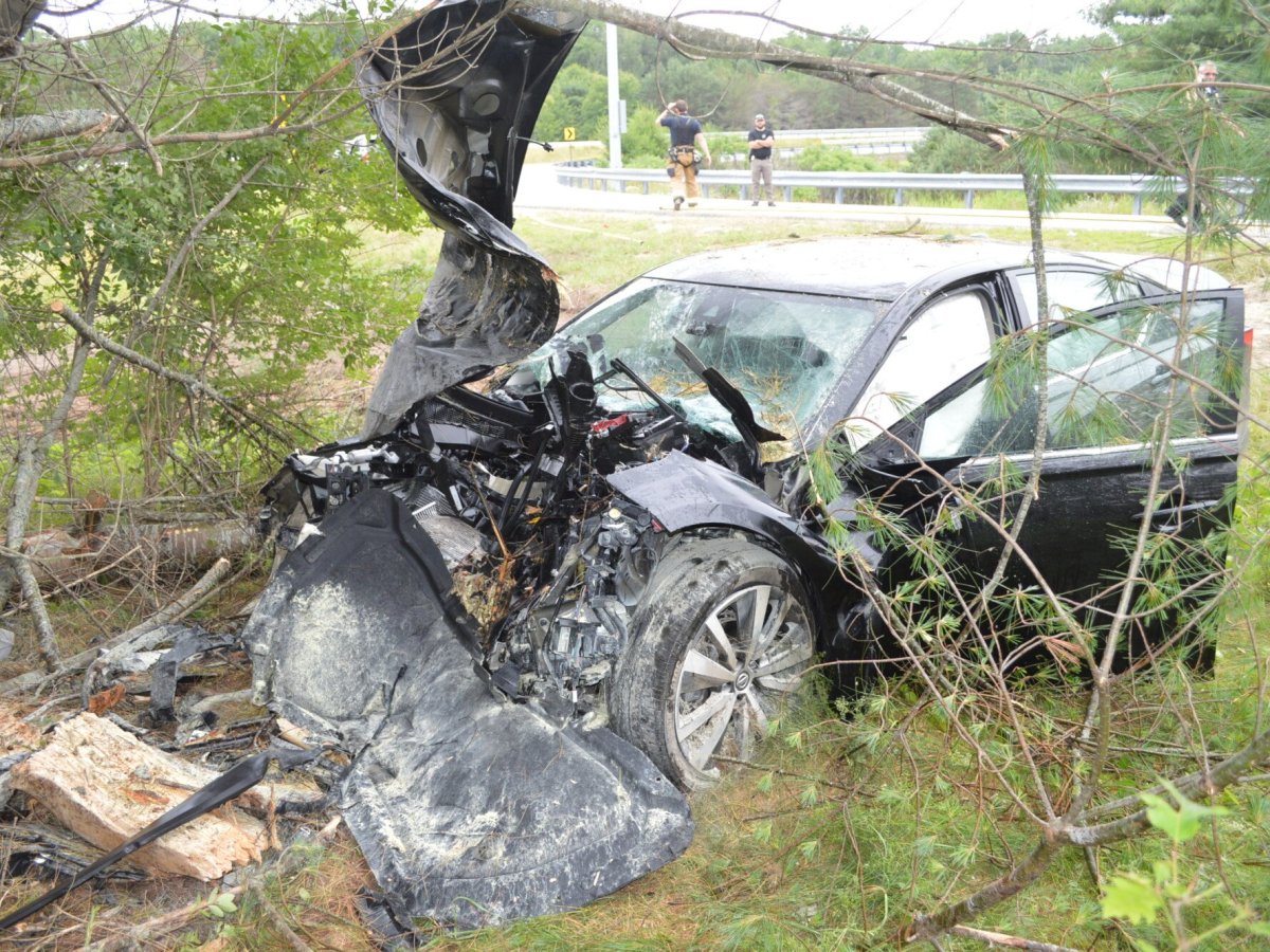 Car crashes into trees, catches fire while exiting I-295 in Brunswick
