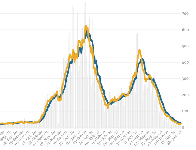The seven-day average of new daily cases rose to 70, a few days after the state recorded its first daily count over 100 in more than a month.