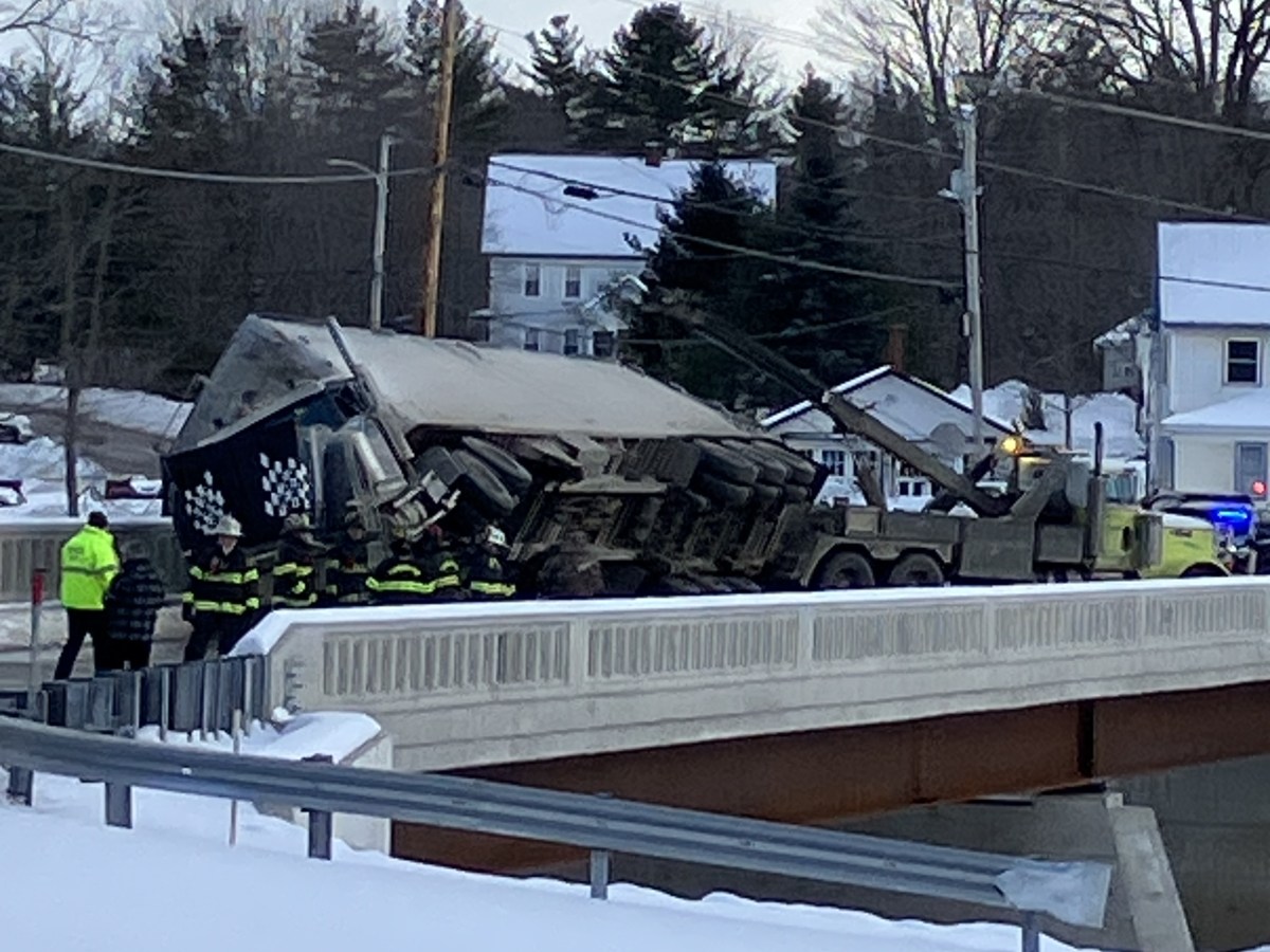 Tractor trailer truck rolls onto side on new Farmington bridge