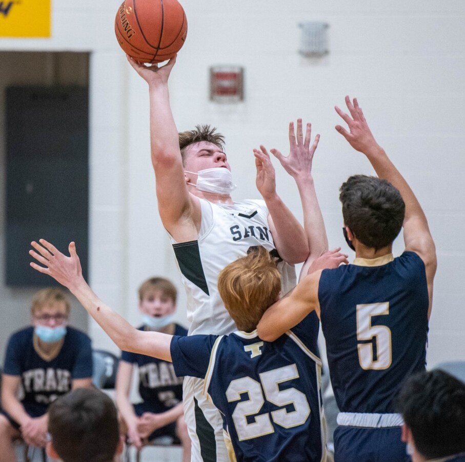 Boys basketball: Gabe Carey leads in scoring and Jonathan Tangilamesu cleans up the glass in the Saints’ home playoff victory.