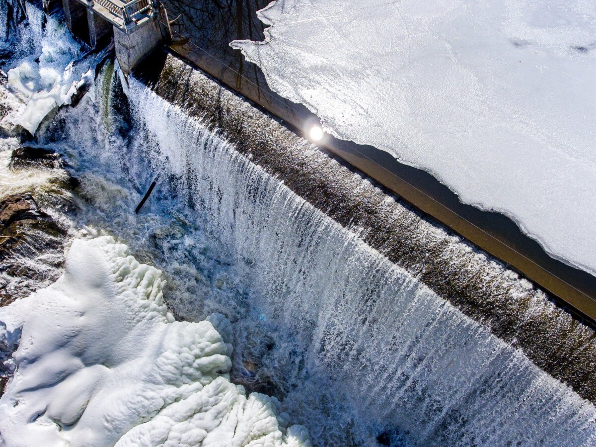 Water cascades onto frozen rocks below an Auburn dam on the Little Androscoggin River.