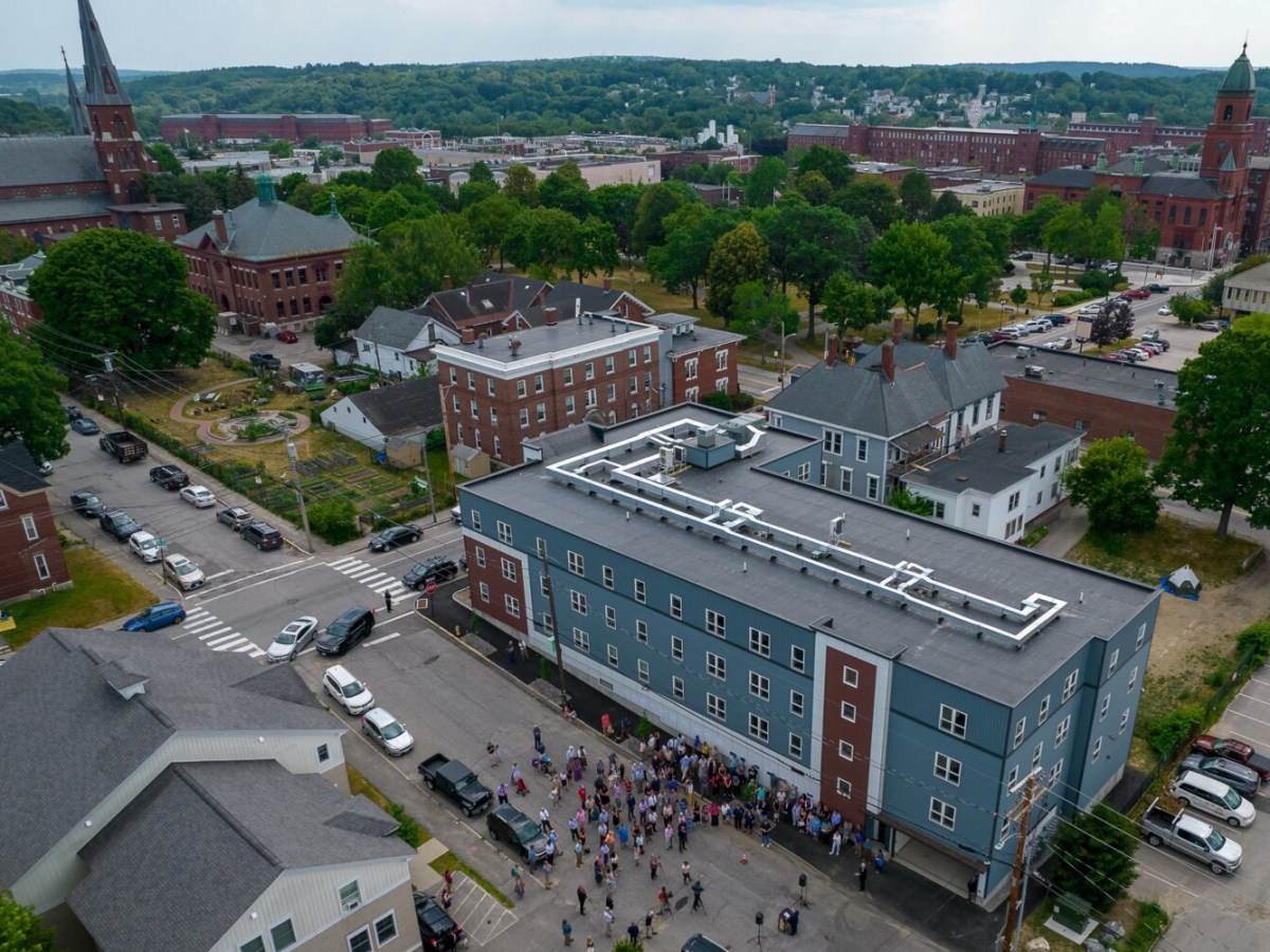 Gov. Janet Mills and other dignitaries attend a ceremony for the opening of a 35-unit apartment complex Tuesday.