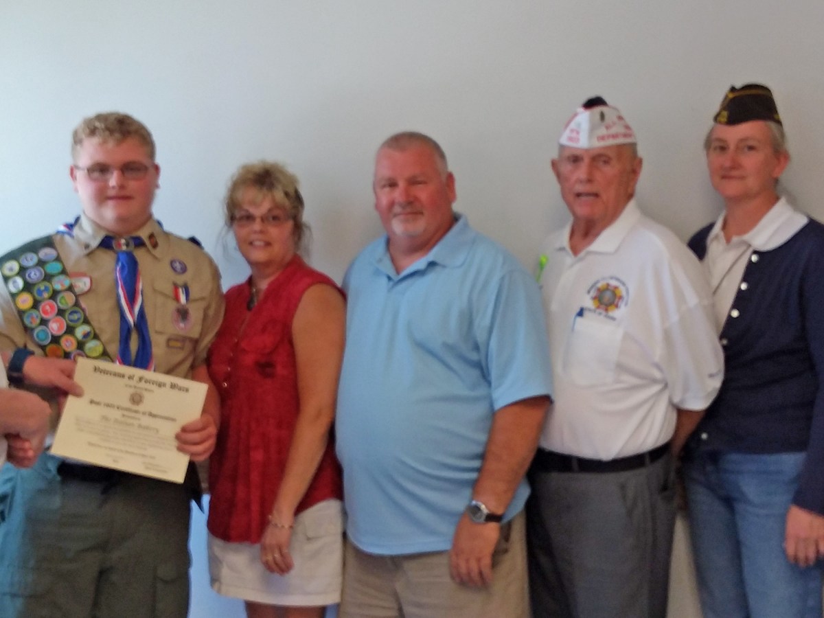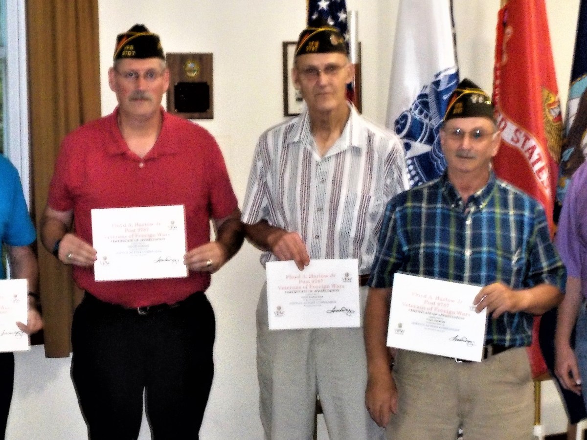 Post 9787, Veterans of Foreign Wars, South Paris, honored its past commanders with certificates of recognition, past commander pins and VFW pins presented by Commander Teresa Drag. From left are Tarmo Raasumaa, Dennis Durant, Onni Raasumaa, Paul Drouin and Drag. Missing are Richard Nuesslein and Dane Tripp.