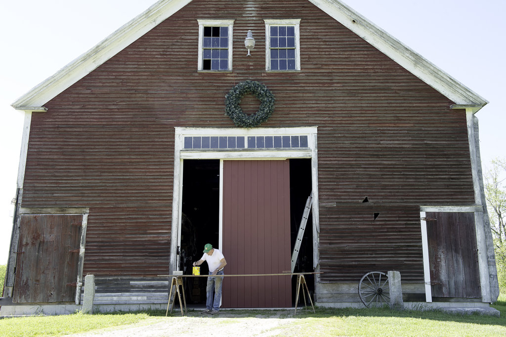 Don Rose stains boards for the new barn door he is building on his hay farm in Greene on Thursday. Rose had the barn moved four years ago and once it was put on a new foundation, the twin sliding doors were a foot short. (Daryn Slover/Sun Journal)