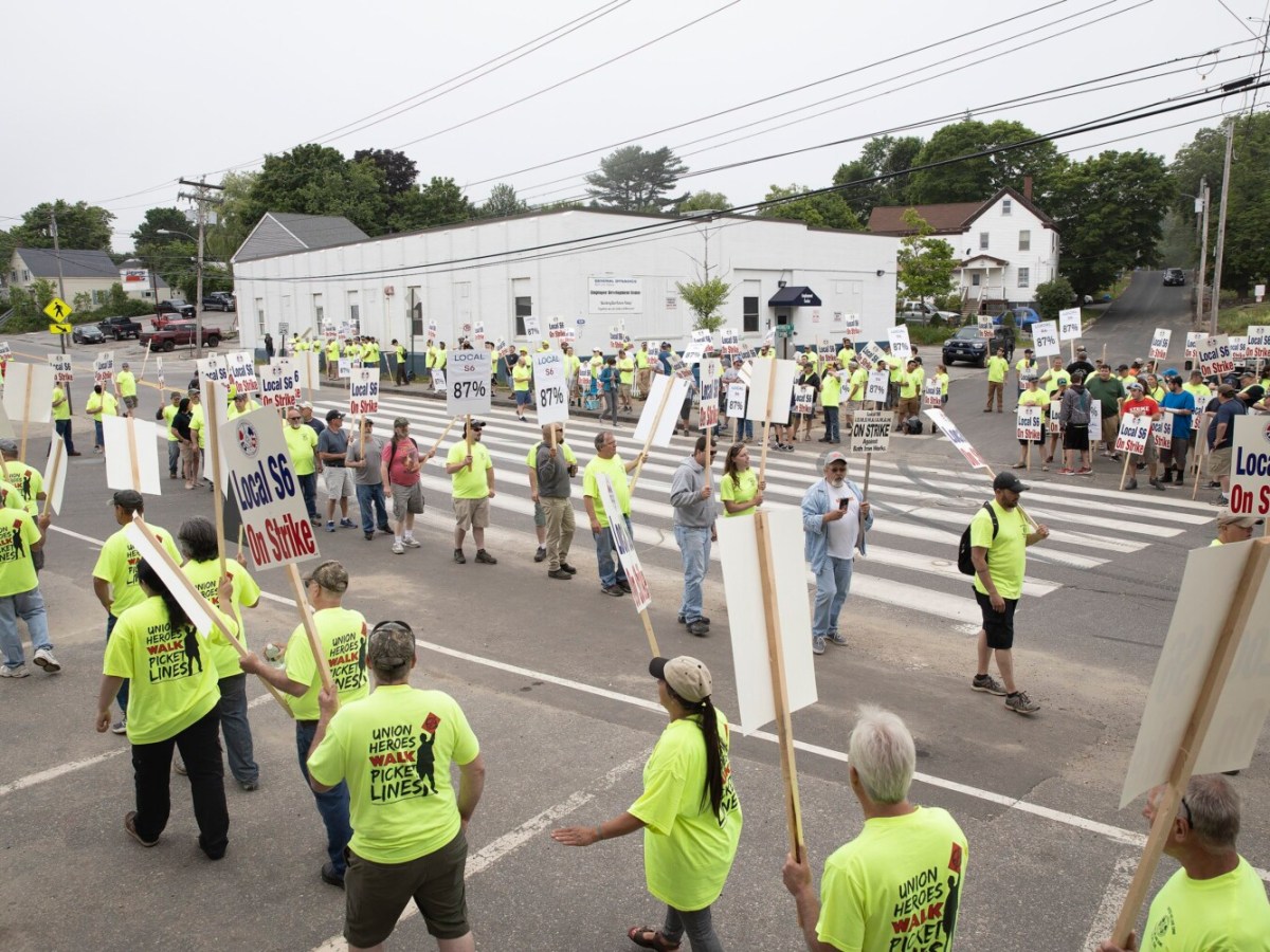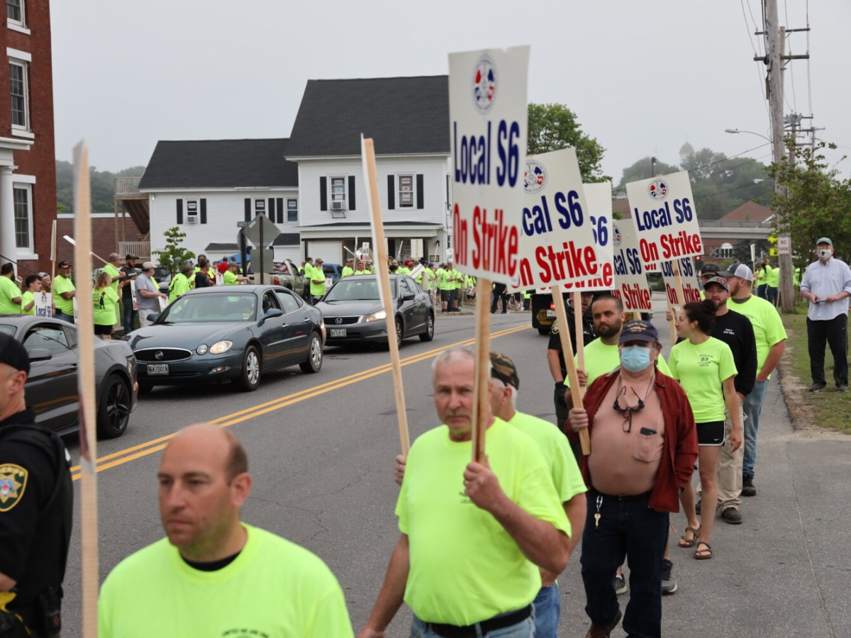 The Bath shipyard’s largest union pickets over subcontracting, seniority.