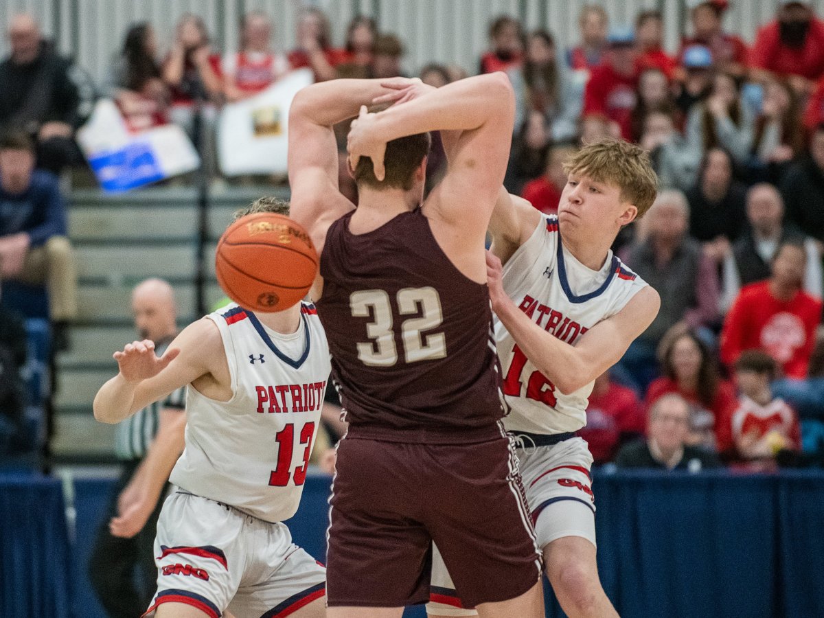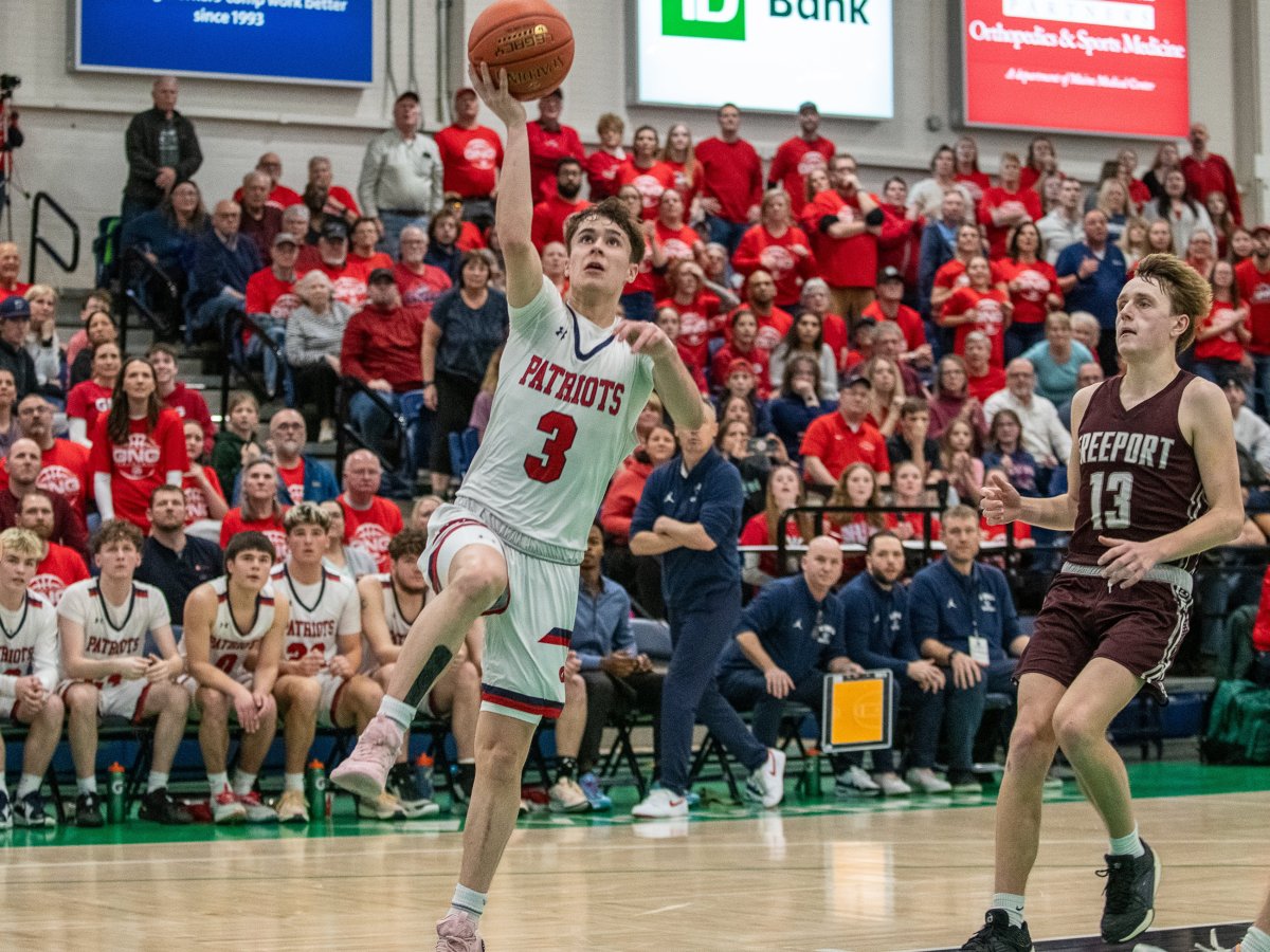The Patriots’ quarterfinal victory is powered by big runs in each half, and they overcome a tournament-record shooting display from the Raiders’ Jagger Helwig.